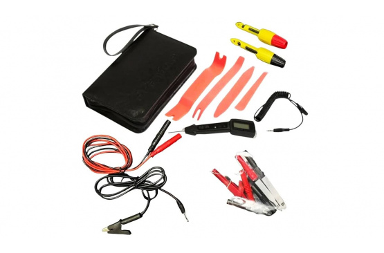 Все инструменты упакованы в небольшую и очень удобную кожаную сумку-чехол. Все инструменты фиксируются вшитыми эластичными держателями, а также имеются специальные карманы для кабеля и расходных материалов, необходимых при работе с электрооборудованием автомобиля.